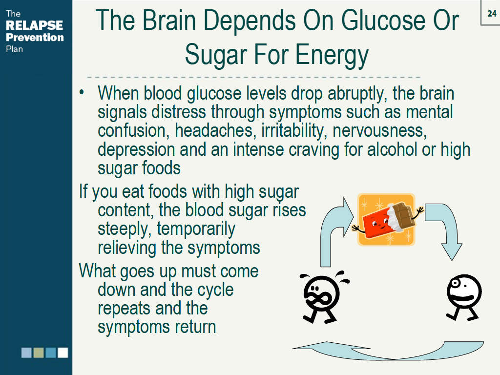 - When blood glucose levels drop abruptly, the brain signals distress through symptoms such as mental confusion, headaches, irritability, nervousness, depression and an intense craving for alcohol or high sugar foods