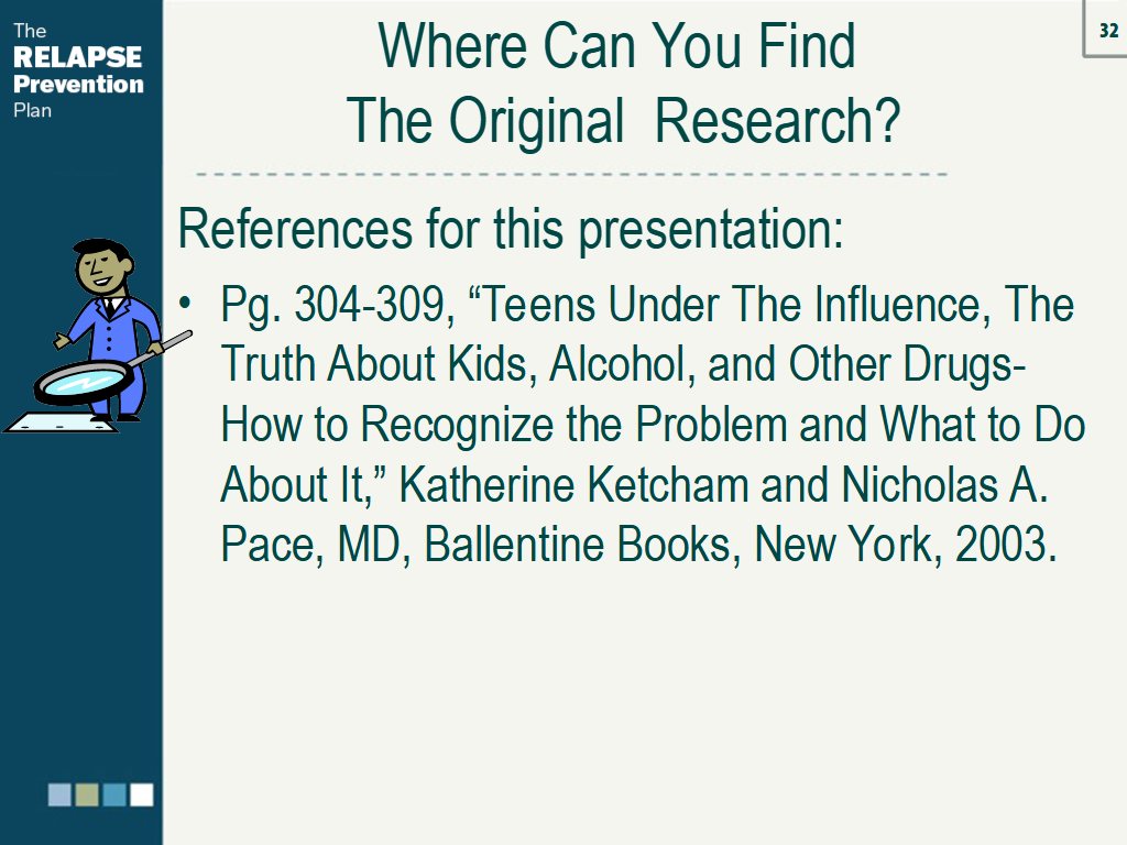 - Pg. 304-309, “Teens Under The Influence, The Truth About Kids, Alcohol, and Other Drugs-How to Recognize the Problem and What to Do About It,” Katherine Ketcham and Nicholas A. Pace, MD, Ballentine Books, New York, 2003.